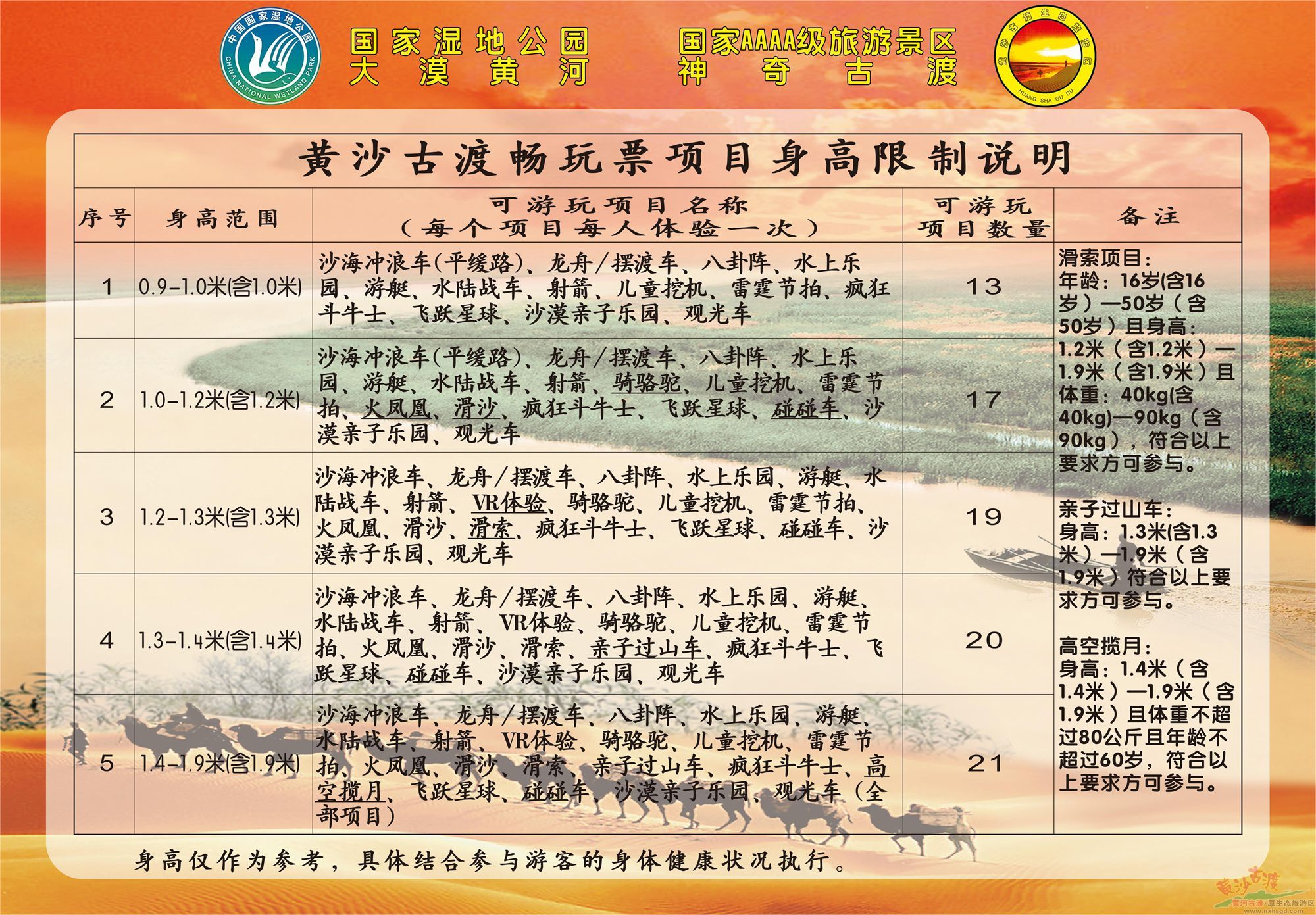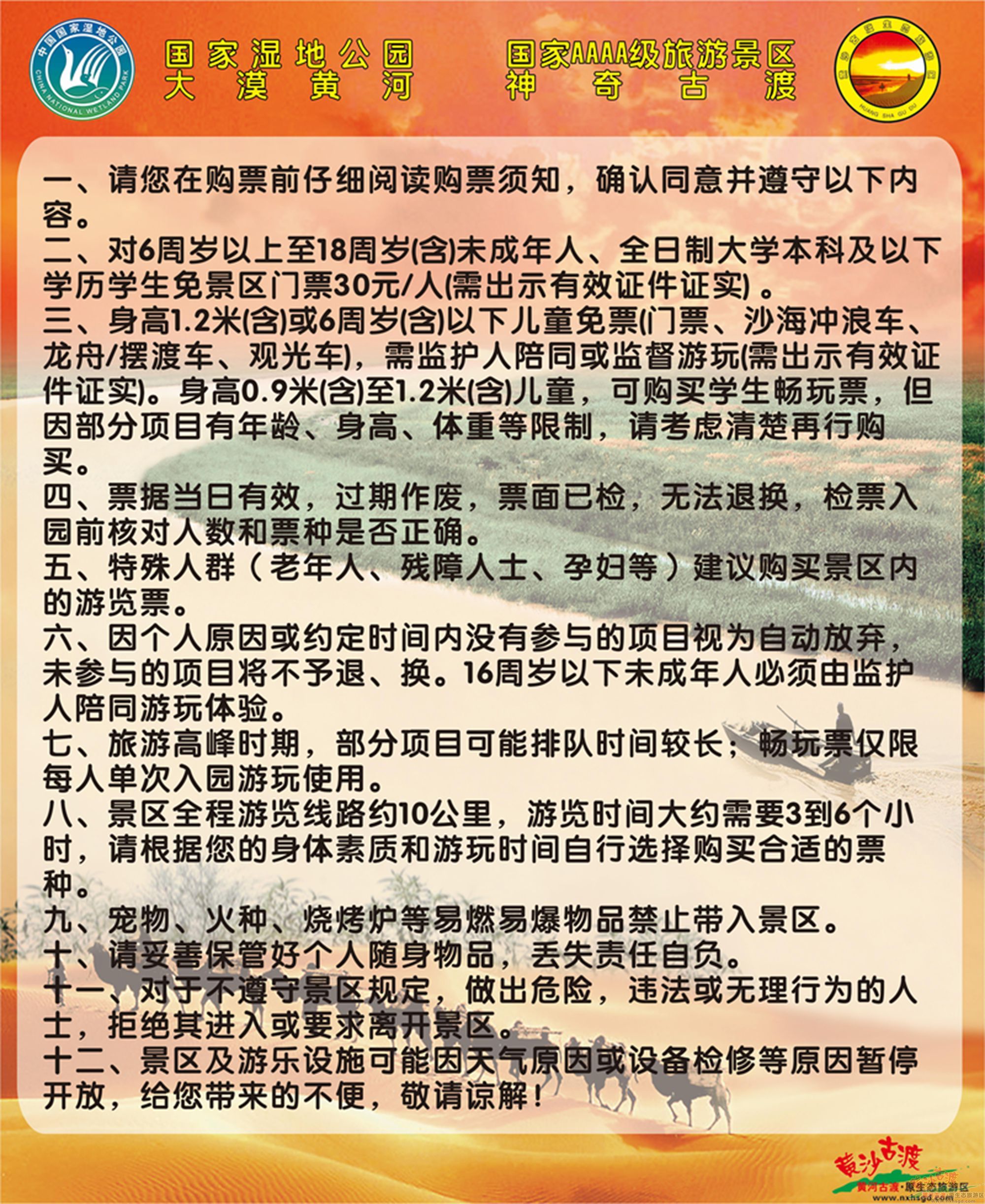 1、身高1.2米或6周岁以下儿童免票(门票、沙海冲浪车、龙舟/摆渡车、观光车),需监护人陪同或监督游玩;