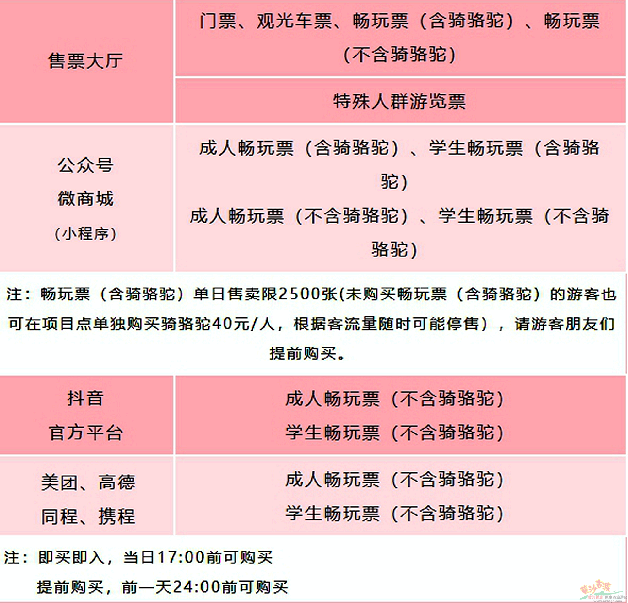 1.畅玩票(含骑骆驼)单日售卖限2500张(未购买畅玩票(含骑骆驼)的游客也可在项目点单独购买骑骆驼40元/人,根据客流量随时可能停售),请游客朋友们提前购买。