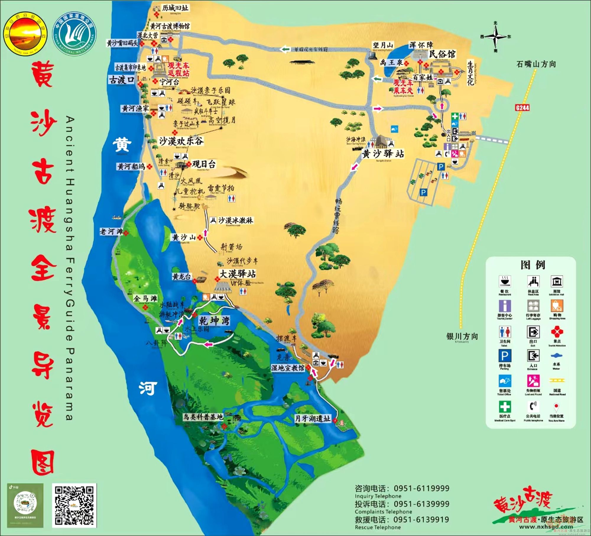 园区入口→黄沙驿站(乘坐去程观光车)→黄河古渡博物馆
